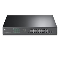 TP-LINK, 18 port Easy Smart Managed Ethernet PoE+ switch. 16x 10/100/1000 Gigabit 802.af/at (15.4/30W) PoE+ ports; 2x Gb ports, 2x combo SFP ports. Supports IEEE 802.3af Power over Ethernet on 16x ports with a total power budget of 250W. 36 Gbps cap.